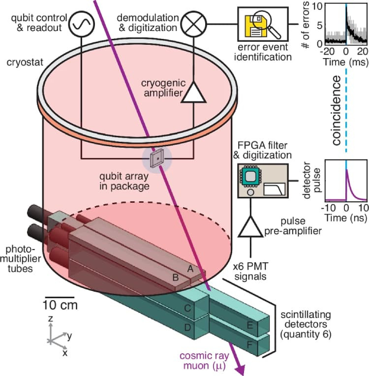 To visualise how researchers traced cosmic particles to qubit instability, the study included a synchronous detection setup combining superconducting qubit readouts with nearby cosmic-ray sensors. This arrangement allowed precise correlation between particle strikes and multi-qubit relaxation events.