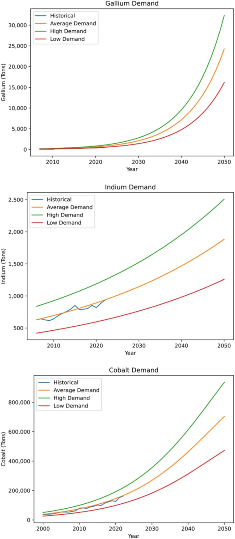 Global demand projections for gallium, indium, and cobalt to 2050, with low (red), average (orange), and high (green) scenarios; historical data shown in blue. (Click to Enlarge)